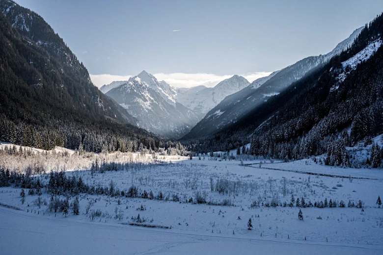 Weiter taleinwärts geht es am Ausichtsturm vorbei durch den Wald zur Waldhäuslalm. Direkt nach der Waldhäuslalm zweigst Du rechts ab, querst die Brücke über den Untertalbach und wanderst auf dem geräumten Forstweg weiter zur Sondl-Alm. Entlang des Weges hast Du hier immer wieder einen wunderbaren Blick auf die Loipen, die entlang des Untertalbaches ebenfalls zur Sondl-Alm führen.