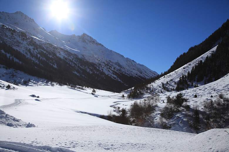 Der Winterwanderweg führt südwärts ins Jamtal, wo du bereits zu Beginn einen atemberaubenden Blick auf den Jamtalgletscher hast. Das Jamtal ist eines der schönsten Seitentäler des Paznaun, umgeben von zahlreichen 3.000ern wie der Vorderen und Hinteren Jamspitze. Nach etwa 2 Kilometern endet der Weg, und du kehrst auf derselben Strecke zurück.