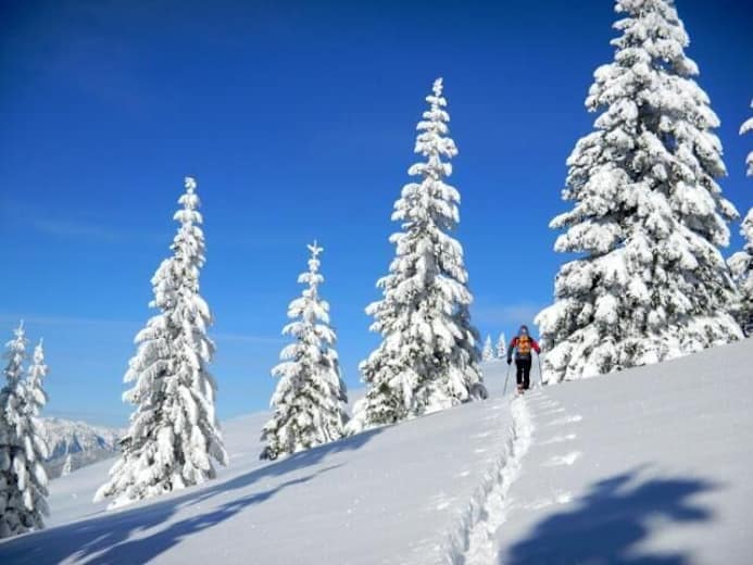 Wir starten unsere Winterwanderung am Dorfplatz in Fischbach und spazieren gemütlich (hier noch ohne Schneeschuhe) die Dorfstraße an der Kirche vorbei zur Fischbacher Volksschule. Zwischen Volksschule und Friedhof zweigen wir rechts zur Roseggersiedlung ab und folgen dem Wanderweg Nr. 1 in Richtung Märchenwiese. Am Ende der Siedlung legen wir unsere Schneeschuhe an und wandern durch einen schneebedeckten, glitzernden Wald bis wir schließlich zu einer Wiese kommen. Hier laden einige Bänke zum Rasten und Verweilen ein.