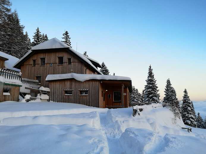 Nicht allzu schwierige Winterwanderung im Naturpark Mürzer Oberland entlang einer ehemaligen Skipiste zum ganzjährig bewirtschafteten Waxriegelhaus. Hier kann man nicht nur einkehren, sondern genießt auch noch das herrliche Alpinpanorama über die Rax.