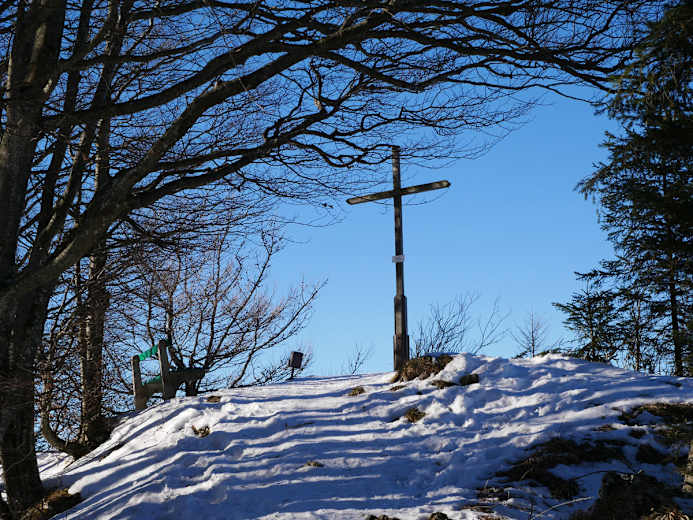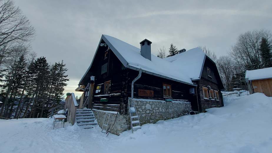 Schöne Winter-Rundwanderung zum Gipfel der Hohen Dirn, 1.134 m, in den Oberösterreichischen Voralpen in der Region Steyr. Am Rückweg kommt an der Anton-Schosser-Hütte vorbei, die ganzjährige geöffnet hat.