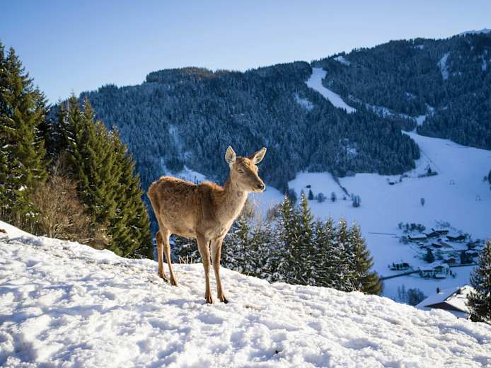 Schöne Winterwanderung für die ganze Familie in der Wildschönau in Tirol. Vom Hotel Staffler in Niederau führt der Weg über den Auenweg und die Fahrstraße zur Jausenstation Foisching mit herrlichem Blick auf Niederau und das Skigebiet. Auf dem Forstweg gelangt man zum Wildgehege, bei dem man Hirsche und Rehe beobachten kann. Start ist in Niederau bei der Talstation Markbachjochbahn.