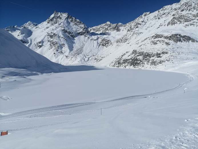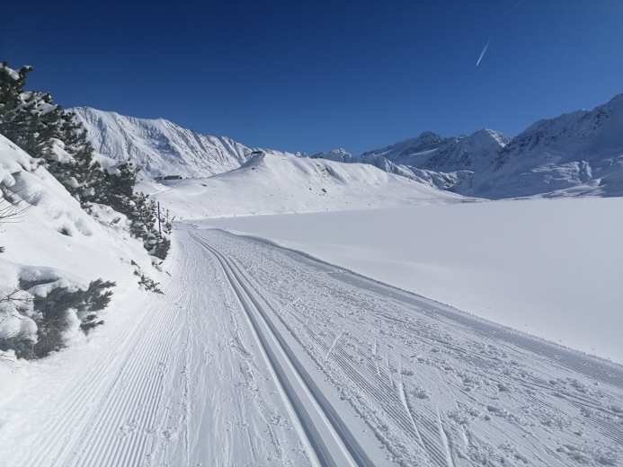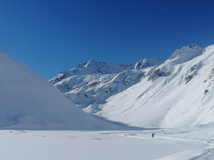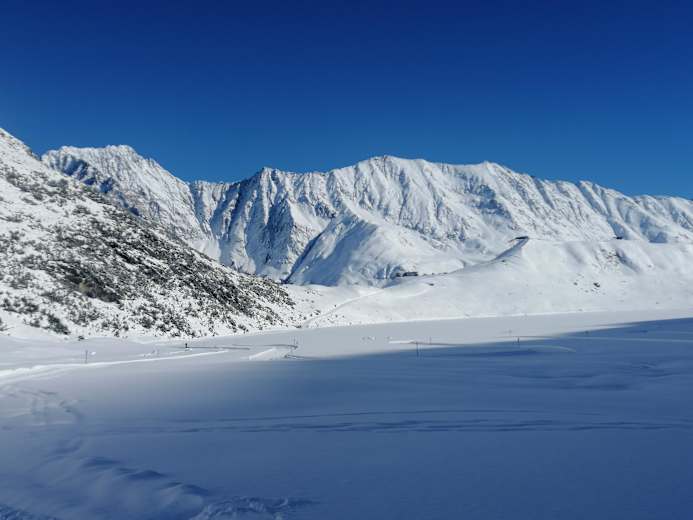 Sonnige Winterwanderung in hochalpiner Lage: Die Runde Rifflseeloipe verläuft auf über 2.200 Metern Seehöhe und begeistert durch ein fantastisches Bergpanorama. Der Ausgangspunkt ist dank Seilbahn von St. Leonhard/Mandarfen im Pitztal ganz bequem zu erreichen.