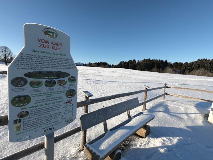 Bei dieser leichten Themen-Winterwanderung spaziert man im bayerischen Pfaffenwinkel in Oberbayern als familienfreundliche Rundtour von der Schönegger Käse-Alm bei Rottenbuch über Wiesen, Weiden und Höfe und wieder zurück. Entlang des gut begehbaren, kinderwagentauglichen Rundwegs erlebt man an zehn Erlebnisstationen spielerisch alles rund um die Milchwirtschaft – von der Futterversorgung über die Kälberaufzucht bis zur Käseherstellung.