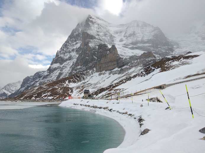 Diese Winterwanderung im Berner Oberland in der Schweiz startet bei der Bergstation des Eiger Express am Eigergletscher, die du bequem mit der Gondel vom Grindelwald Terminal erreichst. Von dort folgt man dem meist bergab führenden Winterwanderweg zur Kleinen Scheidegg, stets mit freiem Blick auf das berühmte Dreigestirn Eiger, Mönch und Jungfrau.