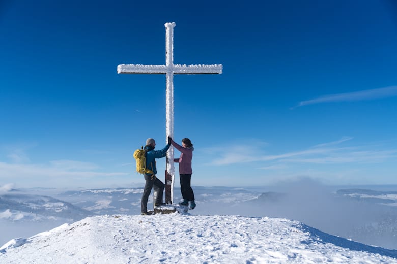 Diese Wintertour bietet ein besonderes Erlebnis mit tollen Ausblicken und einer Gipfelbesteigung. Auf dem Weg eröffnen sich immer wieder schöne Perspektiven auf die verschneite Landschaft und das umliegende Bergpanorama. Nach der Gipfelpassage führt die Route weiter bis zur Einkehrmöglichkeit im „Schwändle“, wo sich die Tour gemütlich ausklingen lässt.