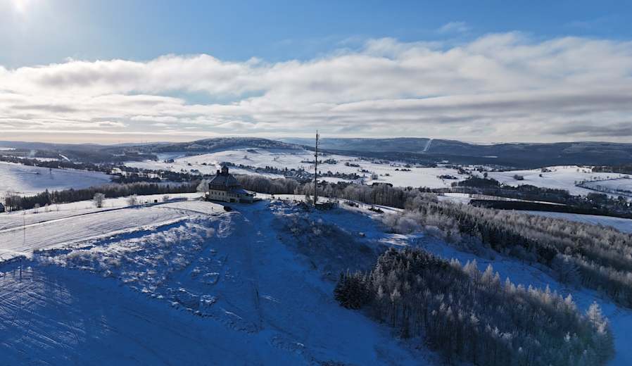Planen Sie unbedingt eine Rast in der traditionsreichen Dachsbaude ein, um bei einem heißen Tee den weiten Blick über das winterliche Erzgebirge zu genießen, bevor Sie den Gipfelsturm auf den Schwartenberg antreten.