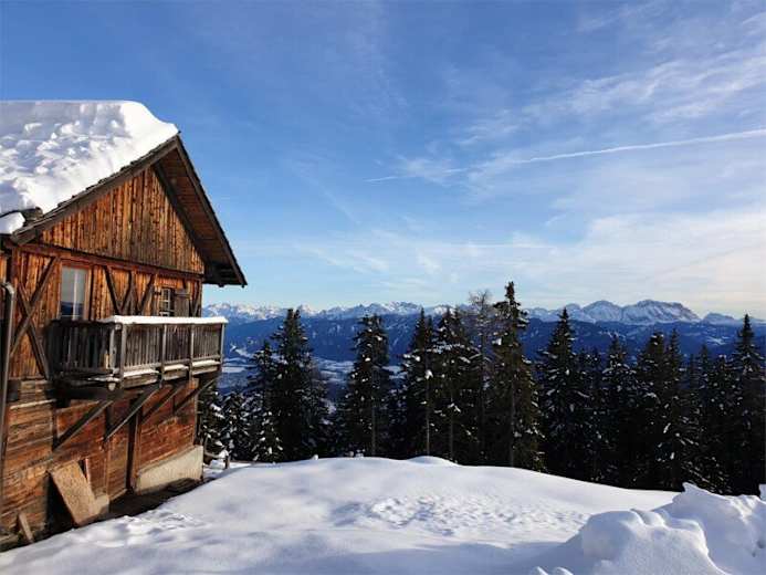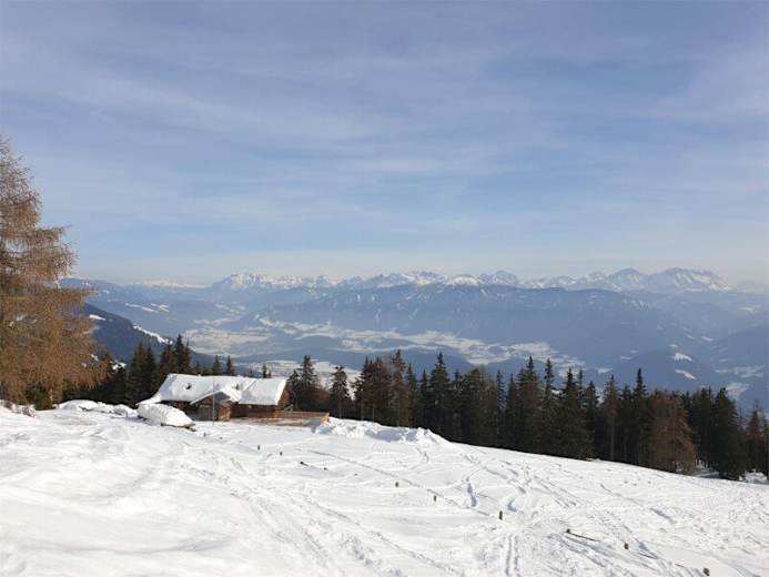 Vom Parkplatz am Schneeberg aus führt ein präparierter Forstweg mit Markierung 5 hinauf zur Alm. Der Weg ist ideal für eine winterliche Wanderung, und oben angekommen erwartet euch eine herrliche Aussicht auf die verschneite Winterlandschaft. Auch als Rodelstrecke ist der Weg perfekt geeignet und macht die Tour besonders abwechslungsreich.
