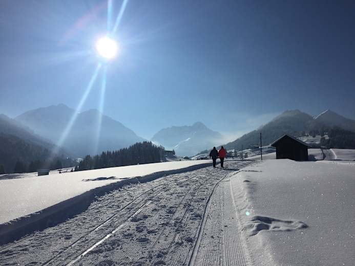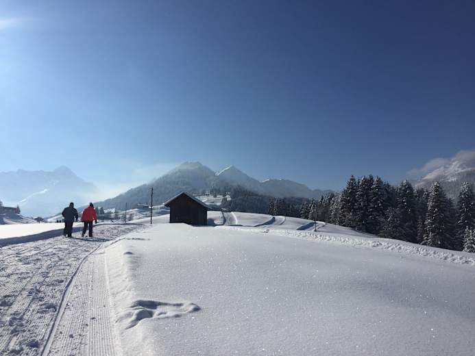 Gemütliche, sonnige Winterwanderung auf präparierten Wegen von Riezlern zur Auenhütte im Kleinwalsertal in Vorarlberg. Die Tour eignet sich für die ganze Familie, ist perfekt mit öffentlichen Verkehrsmitteln kombinierbar und bietet mit der Auenhütte am Fuße des Ifen eine willkommene Einkehrmöglichkeit.