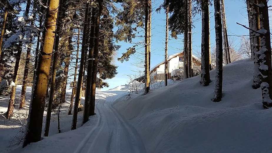 Hinunter geht es auf der anderen Seite auf einem gespurten Winterwanderweg durch einen Wald. Man kommt nach Vöglen und kann hier entweder hinunter nach Müselbach laufen oder man zweigt links ab und folgt dem Winterwanderweg durch einen Wald nach Alberschwende.