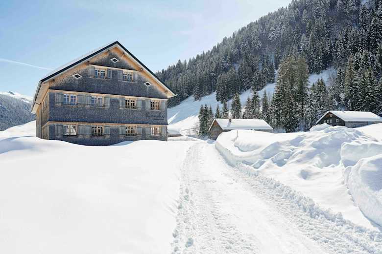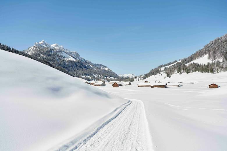 Diese idyllische Winterwanderung im Bregenzerwald führt von Sibratsgfäll zum Krähenberg-Skilift und weiter nach Schönenbach, einer der größten und schönsten Vorsäßsiedlungen in Vorarlberg.