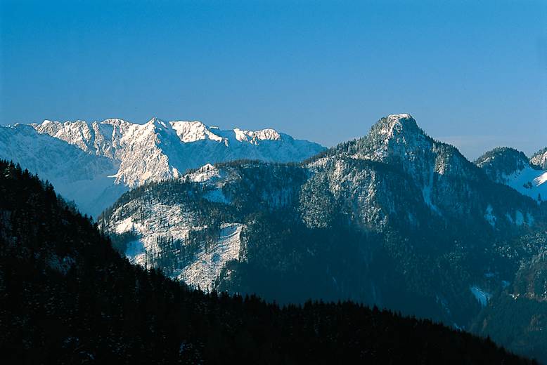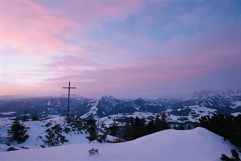 Nur gute 1.400 m ist sie hoch. Im Nordwesten ragt der 400 m höhere Geigelstein auf, im Südosten dominiert jenseits des Walchseebeckens das Unterberghorn, und im Südwesten schaut man direkt auf die Nordseiten des Zahmen und Wilden Kaisers. Zweifellos lohnt sich der Aufstieg zur Rudersburg schon allein wegen des Ausblicks zum Kaiser. Man sieht in ein wahres Zackenmeer von verschneiten Felsgipfeln.
