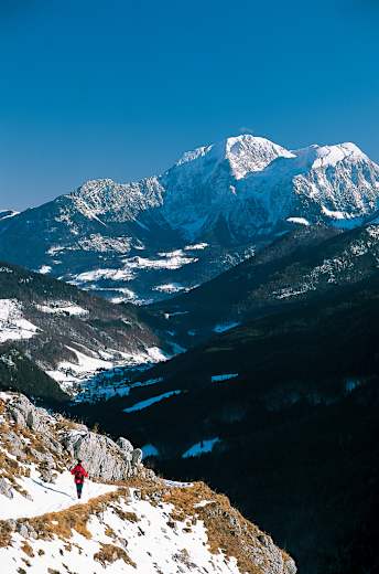 Die Reiteralm – oder Reiteralpe, wie sie offiziell heißt – ist kein „Wintergebirge": eine plateauartige Hochfläche im Berchtesgadener Land, die nach allen Seiten steil in die Täler abbricht und nur durch einige wenige Steiganlagen erschlossen ist. Sobald der erste Schnee liegt, trifft man nur noch rund um die Traunsteiner Hütte auf ein paar Skitourengeher und im Norden des Gebirges auf die Bundeswehr. Diese Wanderung in Bayern begnügt sich daher auch mit dem Almgelände an der Südseite der Reiteralm.