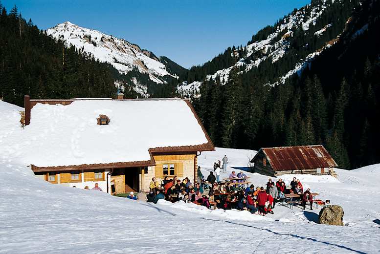 Hier, in der Südwestecke des Allgäus, kommt man sich vor wie am Ende der Welt. Eine lebensfeindliche Sackgasse mit Wänden aus Schnee und Eis. Und doch trifft sich gerade in dieser fast schon beklemmenden Einöde der warm geheizten Bärgunhütte das nach Urwelten süchtige Volk aus nah und fern, um der berauschenden, unverfälschten Winternatur für zwei oder drei Stunden ganz nah zu sein. Damit es auf dem Rückweg nicht langweilig wird, hat der freundliche Hüttenwirt auch noch den kurvigen Weg auf der östlichen Talseite gewalzt. So ergibt sich eine unterhaltsame Runde für Jung und Alt.