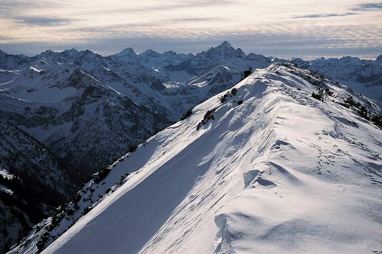 Das schon während des Aufstiegs bewundernswerte Spitzenpanorama hält zu guter Letzt noch ein paar Bonuspunkte bereit. Die Allgäuer Hochalpen werden durch so „versteinerte Bonzen" vertreten wie die gekrümmte Urbeleskarspitze, den Sieger des alpinen Schönheitswettbewerbs namens Hochvogel, die Respekt verschaffende Marchspitze, den Regenten Krottenkopf, die grazile Trettachspitze und das charaktervolle Schlusslicht Biberkopf.