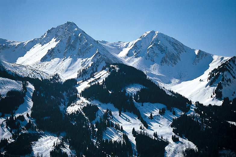 Aus dem Herzen des Tannheimer Tals entwächst das rassige Felsduo Gimpel und Kellespitze, die Rote Flüh im Vordergrund hebt sich, von hier aus betrachtet, kaum von ihren gewaltigen Nachbarn ab.