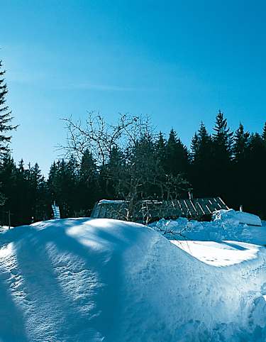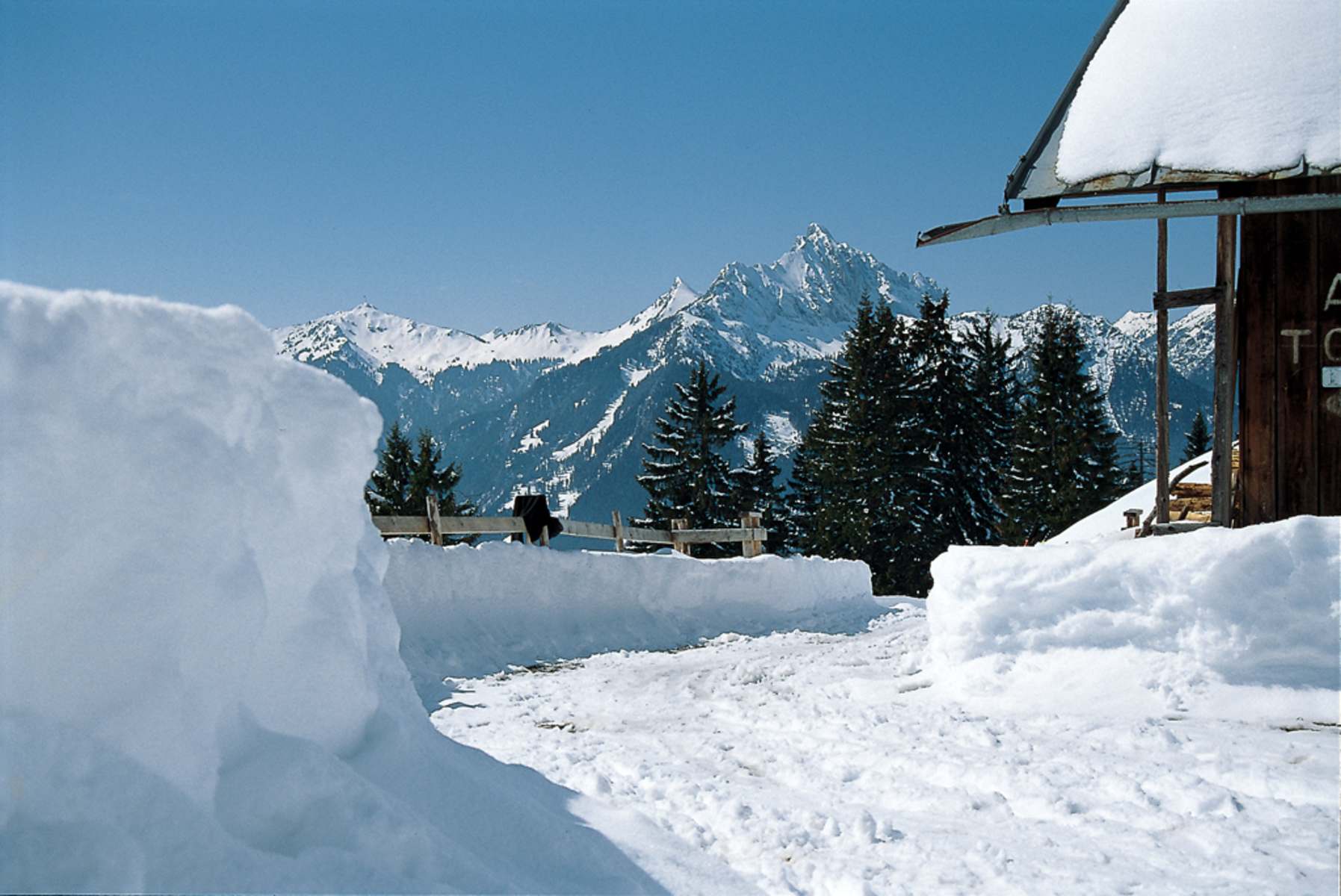 Reuttener Aussichtsloge mit Pfiff: In einer begnadeten Lage auf einer Lichtung unter den bewaldeten Sattelköpfen lädt die Dürrebergalm die Touristen, vor allem aber auch die Einheimischen, zu einer beschaulichen Schneewanderung hoch über dem Reuttener Talkessel.