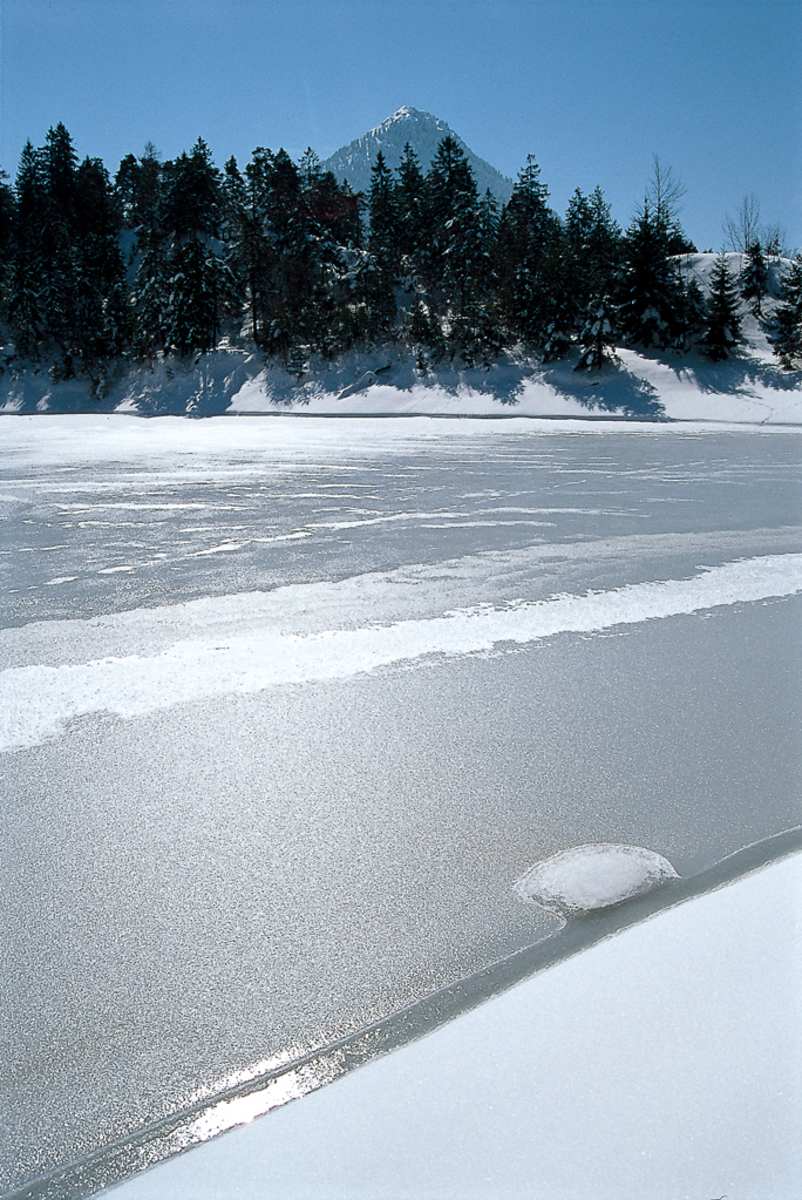 Rechts in eine Querstraße einschwenkend kommt man zur Sparkasse. Bei dieser geht es über die Archbachbrücke. Anschließend bringt uns ein ansteigendes Sträßchen unter der Bundesstraße hindurch zum Urisee, 910 m. Der eisüberzogene See blinkt in einer nur wenige Meter tieferen Waldsenke.