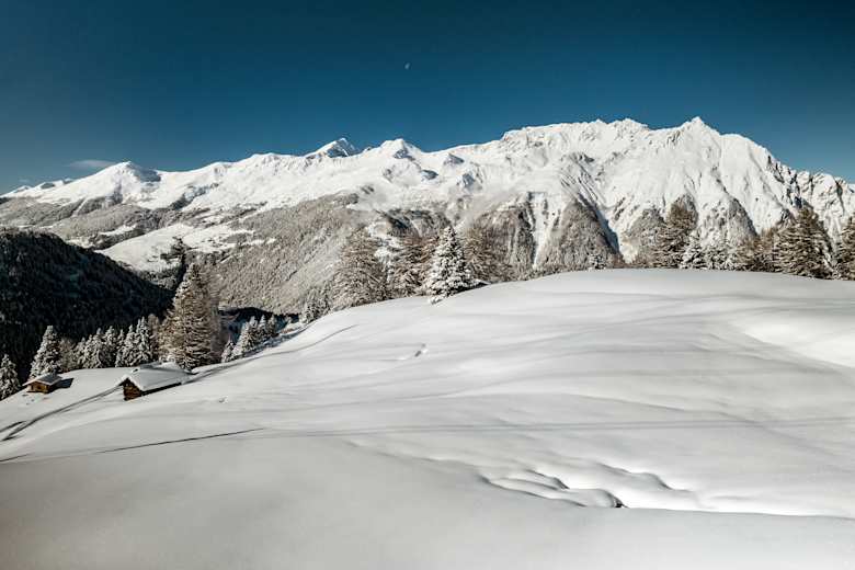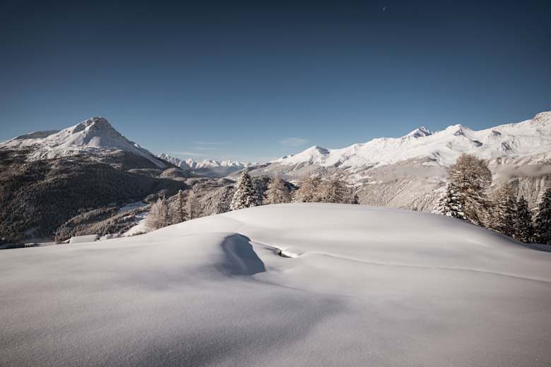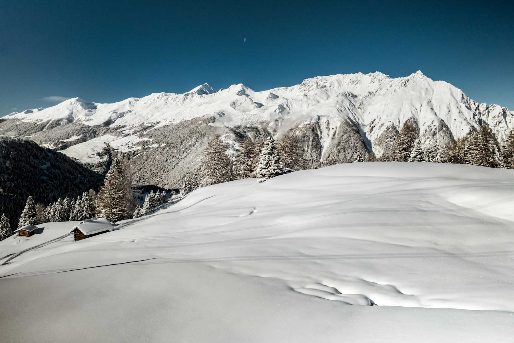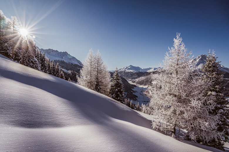 Winterwanderung von Nauders zum Novelleshof: Über den Wanderweg Nr. 18 marschiert man hinauf zum Novelleshof, wo ein herrlicher Ausblick auf Nauders und das Passtal Reschen die Mühen des Aufstiegs belohnt.