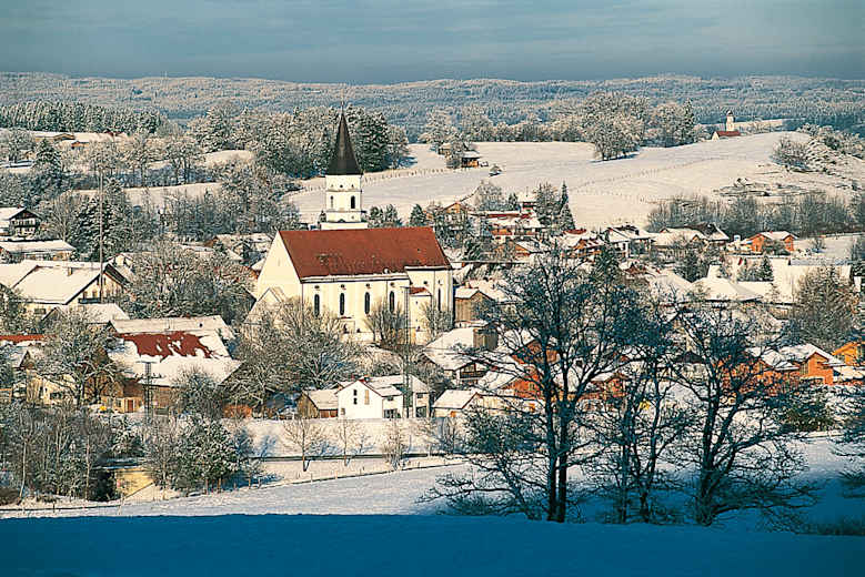 Über einen lohnenswerter Höhenzug oberhalb des Riegsees in Bayern: Diese Tour ist für manche ein Spaziergang, und diese Bezeichnung ist nicht abfällig gemeint. An kalten Wintertagen reichen auch mal wenige Höhenmeter aus, um ins Schwitzen zu kommen, denn das Spuren im Schnee kann ganz schön anstrengend sein. Die Füße werden dabei meist nass und kalt und die Freude auf eine gemütliche Einkehr wird umso größer. Gerade nach großen Neuschneemengen ist diese Tour empfehlenswert. Auf den sanften Hügeln bleibt der Schnee liegen und rauscht nicht als Lawine ins Tal. Im tief verschneiten Wald rieselt der Schnee von den Tannenzweigen, und in den Schneekristallen bricht sich das Licht. Pfadfinder können Tierspuren identifizieren, und in der Stille kreuzt vielleicht sogar ein Reh den Weg. Und trotz der geringen Höhe unseres Ausgangspunktes ist die Aussicht von diesem so unspektakulären Hügel eine Überraschung. Der besondere Reiz dieser Runde liegt darin, dass es sich anscheinend um einen ganz normalen Waldspaziergang handelt, und dann kommt doch alles ganz anders, als man denkt.