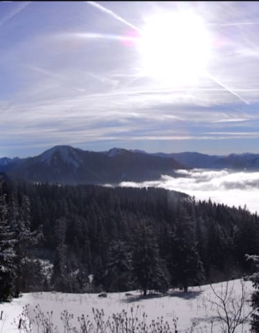 Entlang des Schwarzenbachs im Tözer Land: Fernsicht gibt es hier droben keine, dafür aber den Anblick von Roß- und Buchstein. Von unten wohlgemerkt, denn bei Schnee verfallen die beiden in einen tiefen Winterschlaf.