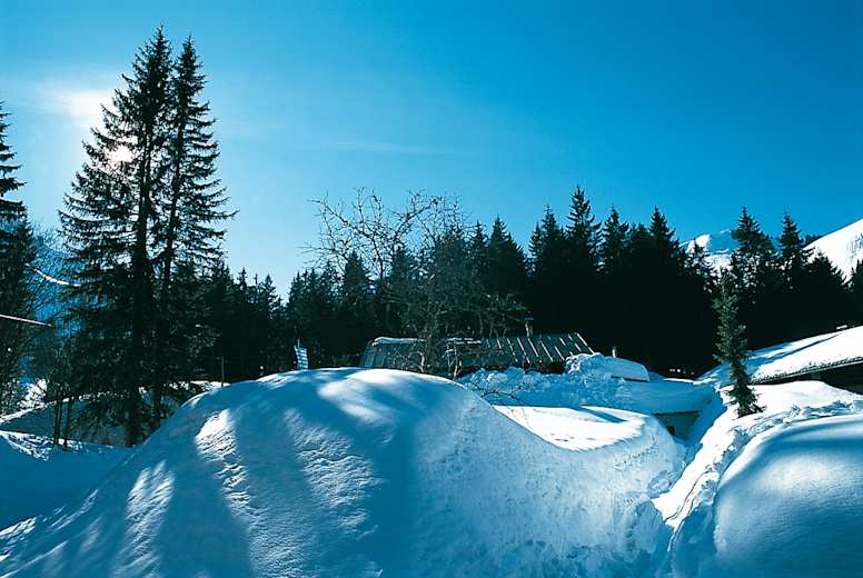 Nun folgen wir der Skidoospur in Richtung Buchsteinhütte. Nach einer ausgedehnten Rechtskurve gabelt sich die Spur. Wir schlagen die rechte Variante ein. Dabei folgen wir den Serpentinen des Skidoos und erreichen schließlich die Buchsteinhütte.