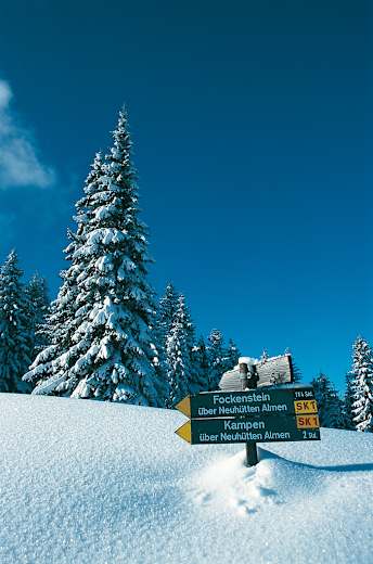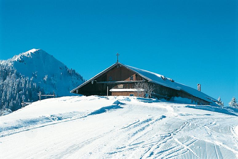 Hinter der Hütte halten wir uns nach Südwesten und folgen dem verschneiten Forstweg bis zum Beginn des Fockenstein-Ostkammes. Wir wenden uns nach links und gehen unterhalb des Kammansatzes weiter nach Südwesten. So gelangen wir zu den Neuhüttenalmen auf 1.329 m. Dahinter steht die kleine Gedenkkapelle des „Club Alpiner Skiläufer" aus München.