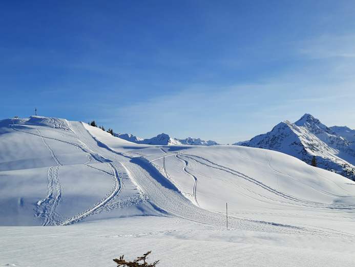 Schöne Winterwanderung im Klosteral in Voralberg. Diese Tour auf präpariertem Weg beginnt mit einer Bergfahrt der Sonnenkopfbahn. Von der Bergstation wandert man gemütlich bis zum Gipfelkreuz des Muttjöchle (2.074 m), wo eine wunderschöne Aussicht ins Klostertal und ins Silbertal wartet.