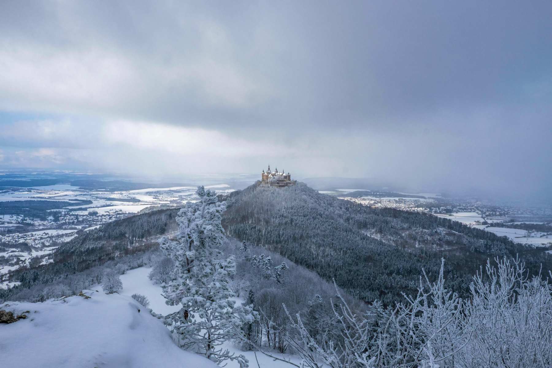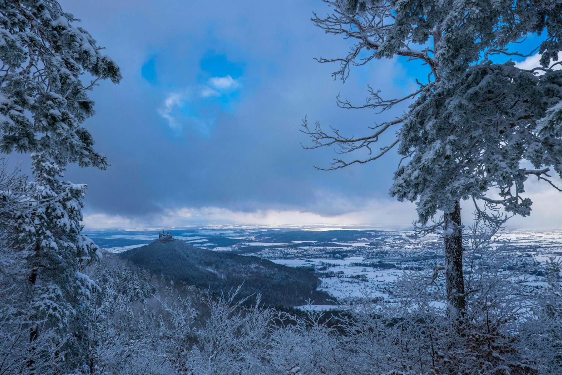 Vom großen Parkplatz am Zollersteighof wandert man auf dem Forstweg in Richtung Zeller Horn. Erst der letzte Abschnitt hinauf zum Aussichtspunkt wird steiler und erfordert bei Vereisung etwas Vorsicht. Oben angekommen, präsentiert sich die Burg Hohenzollern besonders eindrucksvoll. Man steht über der Burg und blickt direkt zu ihr hinüber. Die am Aussichtspunkt aufgestellten Bänke laden zu einer Rast ein. Anschließend wandert man auf dem Traufgang hinüber zum Backofenfelsen. Immer wieder genießt man wunderschöne Ausblicke vom Albtrauf nach Norden.