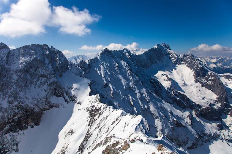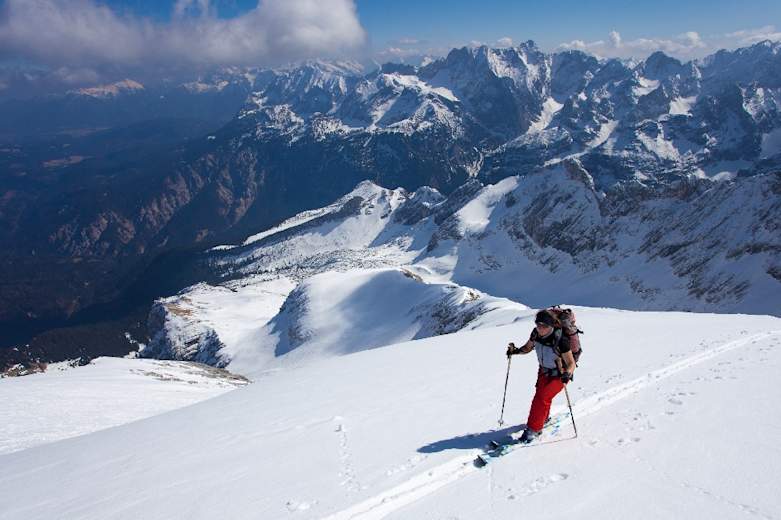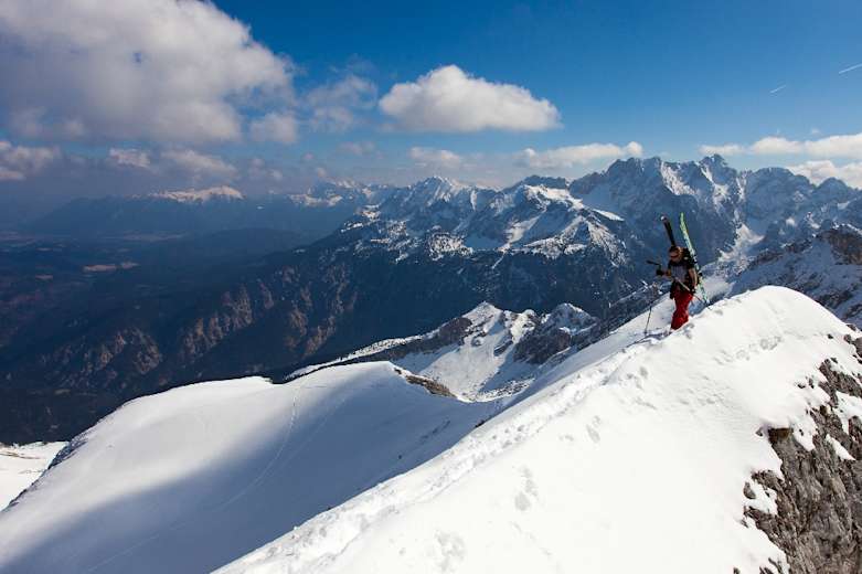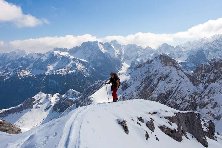 Exponierte Skitour 2.000 Meter über Garmisch-Partenkirchen im Wettersteingebirge und der Mieminger Kette: Die Alpspitze (2.628 m) in Bayern ist nicht nur das Wahrzeichen von Garmisch-Partenkirchen, sondern bietet Skitourengehern auch ein rassiges Ziel. Aufgrund des vorgelagerten Skigebiets leiden zwar Ursprünglichkeit und Ruhe ein wenig, dafür ermöglichen aber die Liftanlagen einen verkürzten Aufstieg und beschneite Pisten eine Talabfahrt bis ins Frühjahr.