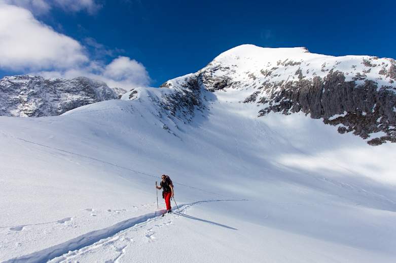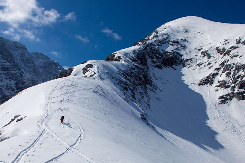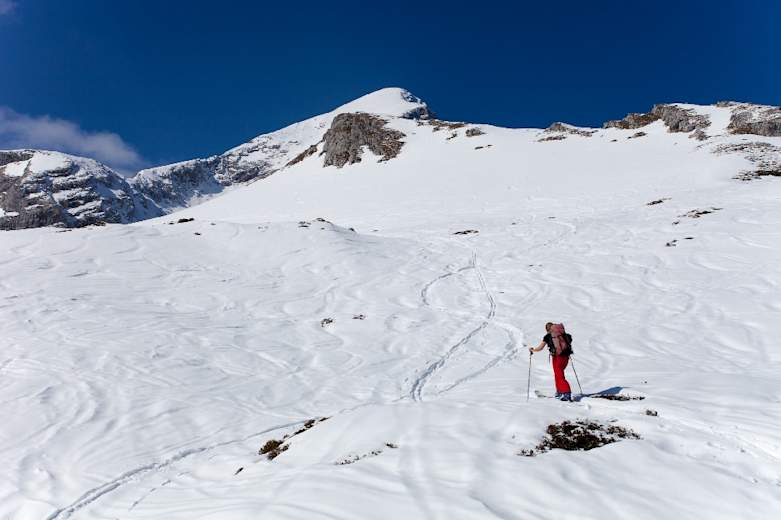 Noch vor Erreichen des Sees biegen wir vor einer Steilstufe durch einen Graben rechts ab und über einen kurzen steileren Hang gelangen wir auf ein weiteres Plateau. Eine leichte Linksquerung bringt uns ins Oberkar, wo von rechts der Direktaufstieg über die Schöngänge heraufkommt. Im Kar ziehen wir in angenehmer Neigung auf die steile Ostflanke zu, bis sich links ein flacher Aufstieg auf den Gratrücken ergibt. Am Grat so weit wie möglich mit Ski, bis diese an den Rucksack kommen oder zurückgelassen werden.