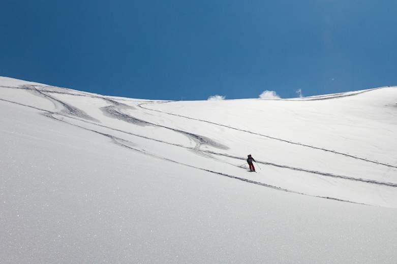 Auf ihr weiter talwärts, wobei wir kurz nach dem Kar auch rechts über einen kurzen Steilhang ins Grieskar hinausqueren könnten. Am Bernadeinlift angekommen, können wir entweder mit dem Schlepplift zurückkehren ins Skigebiet oder die 300 Höhenmeter entlang der Piste aufsteigen. Nun nach Norden zum Kreuzeck und über die Olympiaabfahrt oder die steilere und oft eisige Kandahar zum Ausgangspunkt.
