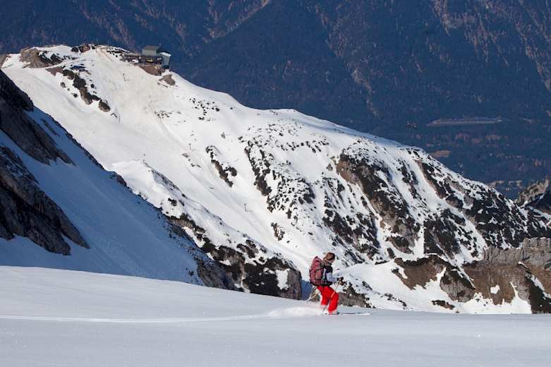 Auffahrt mit der Alpspitzbahn zum Osterfelderkopf. Nun auf der Osterfelder-Abfahrt in Richtung Südosten hinab bis zum Flachstück am oberen Ende des Bernadeinliftes. Über die Bernadeinpiste, oder (bei sicherer Schneelage schöner, aber nicht präpariert) bereits 30 m vorher rechts haltend durch das schattige Kar unter den Bernadeinwänden hinab bis kurz vor die Talstation des Bernadeinliftes.