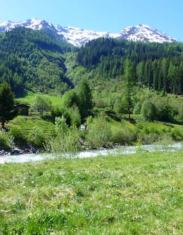 6. Etappe des Meraner Höhenweges von Matatz nach Hochmuth – Höfespringen im Passeiertal. Man steigt bis zum Kalmbach ab und befindet sich auf 820 m am tiefsten Punkt des Meraner Höhenwegs.
