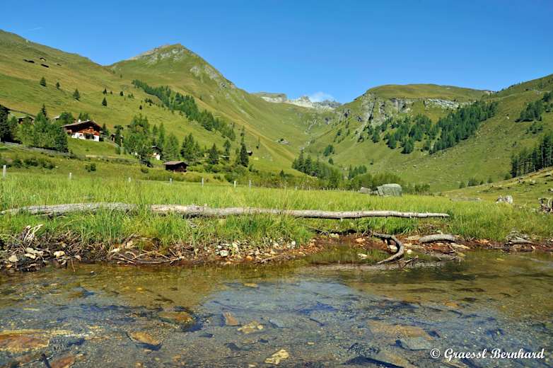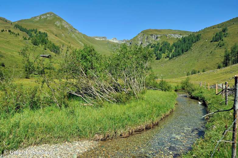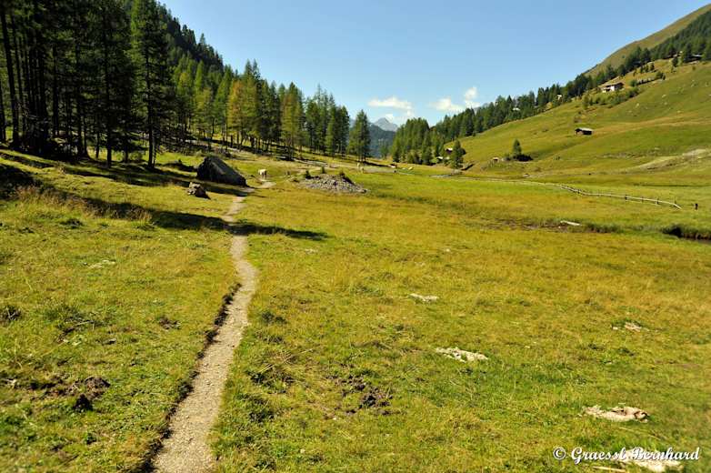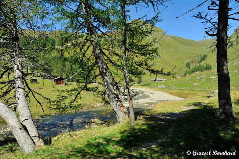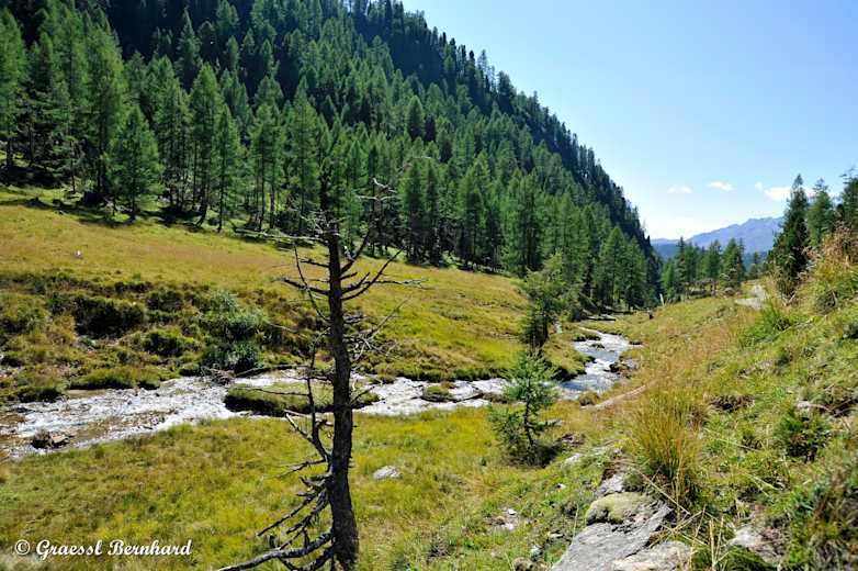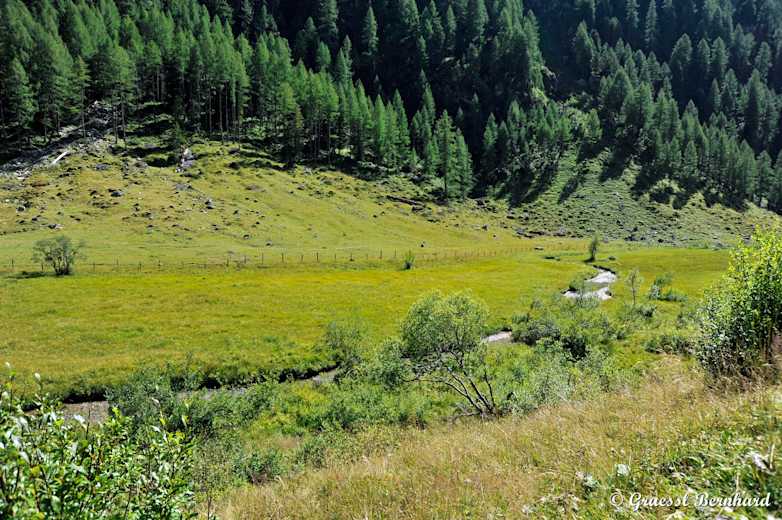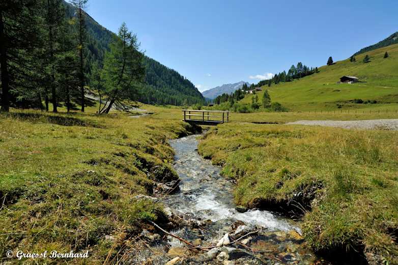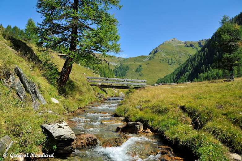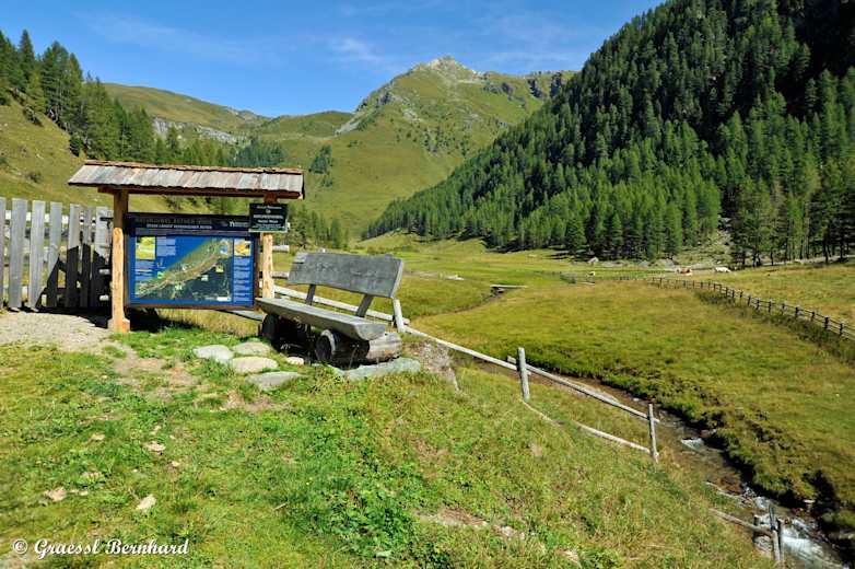 Vorbei an Lärchwiesen gelangt man zu einem Gebirgsbach, der Lebensraum für die Wasserspitzmaus und Wasseramsel ist.Nach der Bachüberquerung führt der Weg an das hintere Ende des Tales, zur Bartler Alm. Am Wegabschnitt nach den Almhütten passiert man artenreiche und farbenprächtige Wiesen. Die landschaftlich reizvolle Umgebung kann man hier in aller Ruhe genießen.Der Rückweg bietet eine einzigartige Aussicht auf die reizvolle Landschaft.