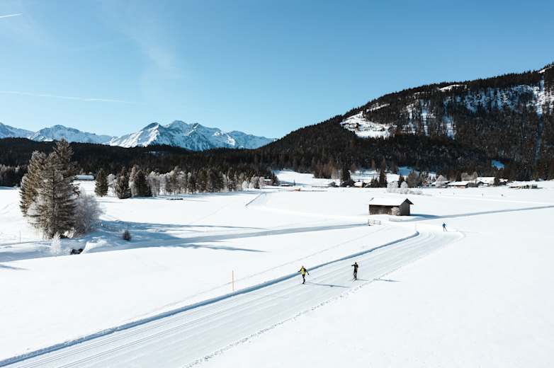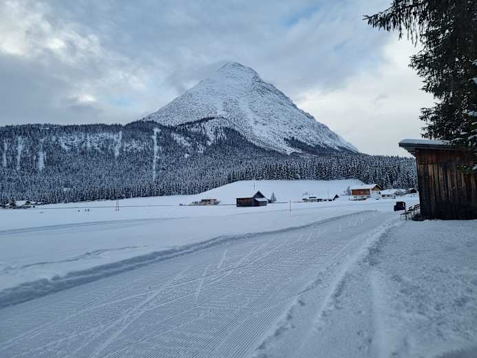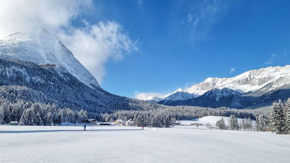 Einfache Langlauf-Loipe in Leutasch nahe Seefeld in Tirol: Diese Tour geizt wirklich nicht mit ihren Reizen. Sie besteht aus einer zweispurigen klassichen Loipe und einer Skating-Loipe und verläuft größtenteils durch freies Feld. Dadurch hat man einen tollen Ausblick auf die Hohe Munde und das Wettersteingebirge. Genuss pur!