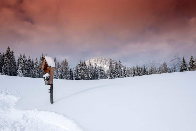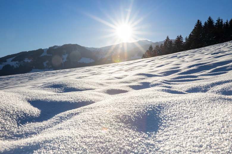Die kurze Tour rund um den Reither Kogel führt ohne große Höhenunterschiede abwechslungsreiche über Almwiesen und durch lichten Wald. Sie eignet sich gut, um die gemächliche und naturnahe Fortbewegungsform mit Schneeschuhen erstmals auszuprobieren.