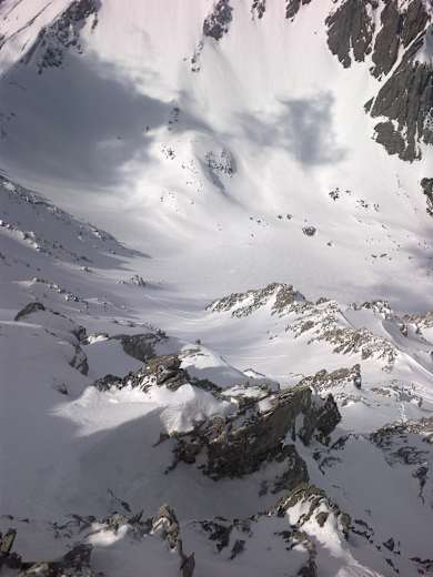 Über das Kar geht es weiter bis zur Gipfelrinne. Am Grat oben lässt man die Ski stehen und erklimmt den Gipfel zu Fuß.
