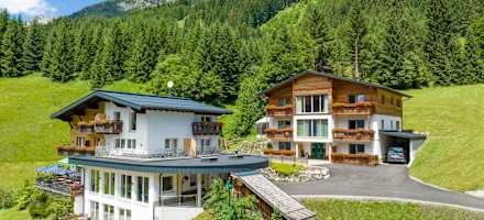 Umrahmt von Bergen, Gipfeln und Blumenwiesen liegt das Hotel Tiroler Herz im beschaulichen Auszeitdorf Hinterhornbach.